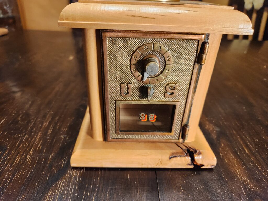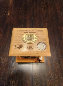 Come in small and medium. Small have engraving no coin. Medium from Grand Lake Colorado, have silver half dollar. Combo cards on bottom. Come in light and dark stains. Elk, eagle, and bear are burnt into lid.