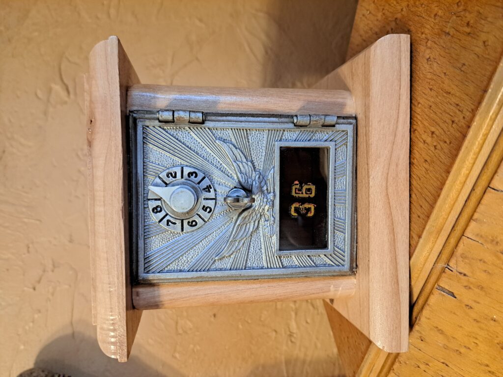 These doors were made in 1943 the only year the doors were made out of zinc alloy as brass and copper were being used for the war effort. They come with a 1943 silver half dollar and banks come with your choice of insignias for each branch of the military. Combo cards are on the bottom. The medium banks also have a challenge coin and some small banks now have a challenge coin also. Large banks have at least 1 challenge coin and silver half dollar with other engraving. Combo cards on bottom. Comes in light and dark stains. Recovered doors from Silverton Colorado. They had a post office fire when my Dad found out about the doors. We cleaned doors to what you see today. Just acquired several small doors from Minneapolis Minnesota. Personalization can be engraved on lids and can use your own Challenge coins if preferred.