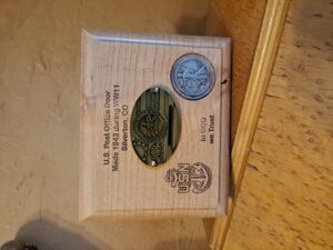 These doors were made in 1943 the only year the doors were made out of zinc alloy as brass and copper were being used for the war effort. They come with a 1943 silver half dollar and banks come with your choice of insignias for each branch of the military. Combo cards are on the bottom. The medium banks also have a challenge coin and some small banks now have a challenge coin also. Large banks have at least 1 challenge coin and silver half dollar with other engraving. Combo cards on bottom. Comes in light and dark stains. Recovered doors from Silverton Colorado. They had a post office fire when my Dad found out about the doors. We cleaned doors to what you see today. Just acquired several small doors from Minneapolis Minnesota. Personalization can be engraved on lids and can use your own Challenge coins if preferred.